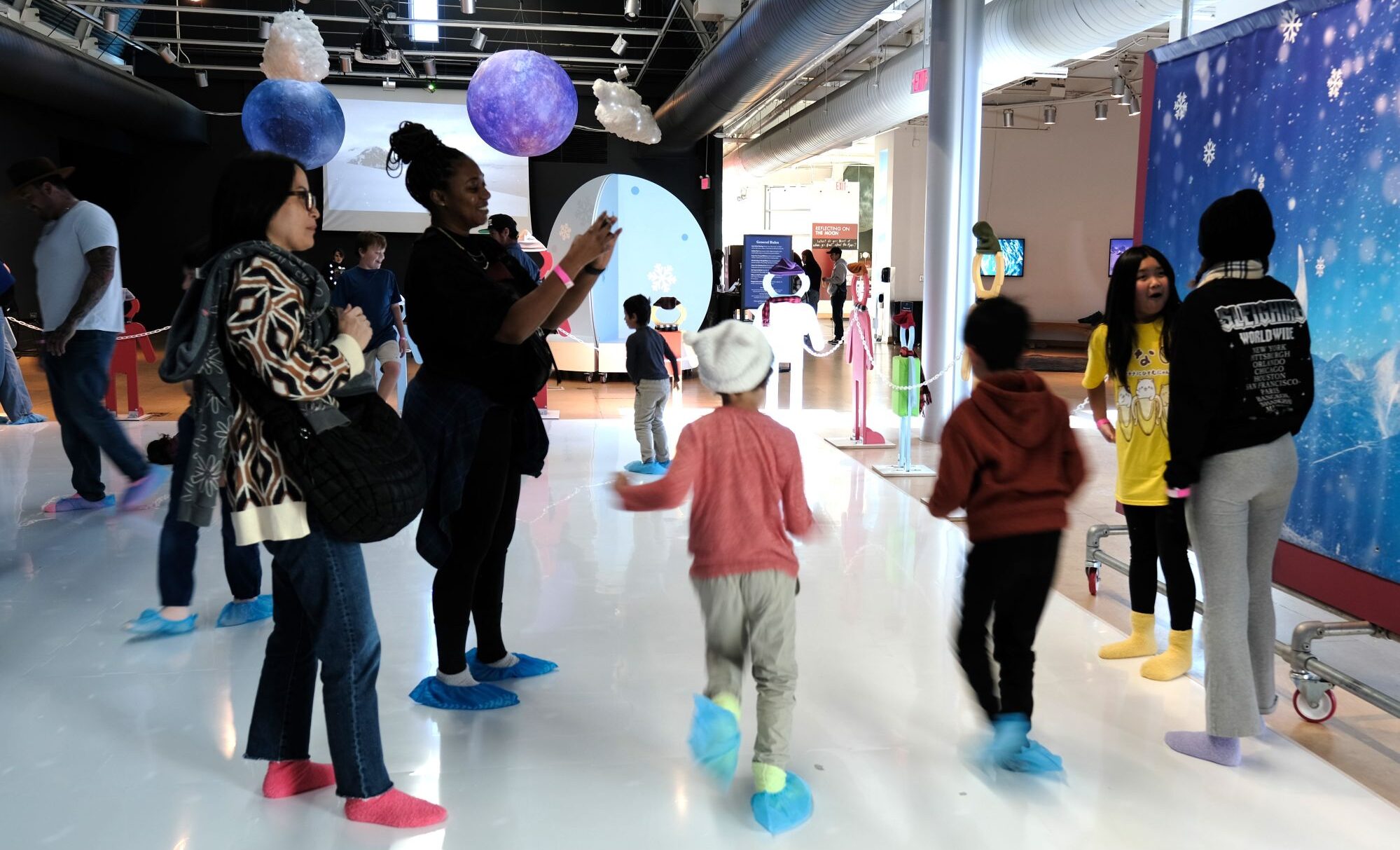 Next, make your way to Pluto, where soft, sparkling ice plains stretch beneath a twilight sky. Here, you can skate across the surface of Pluto itself on our beloved Sock Skate experience! No skates or cold required, just your coziest socks as you glide across a floor that feels like interstellar ice.